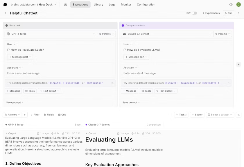 Run the same prompt on multiple models in Braintrust Playgrounds and compare quality, speed, and cost side-by-side. Let the data decide rather than relying on benchmarks or assumptions.
