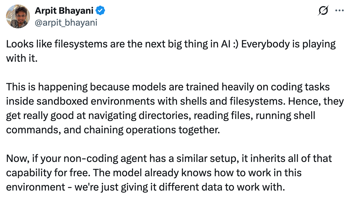 There's a growing conviction in the AI community that filesystems and bash are the optimal abstraction for AI agents. The logic makes sense: LLMs have been extensively trained on code, terminals, and file navigation, so you should be able to give your agent a shell and let it work.