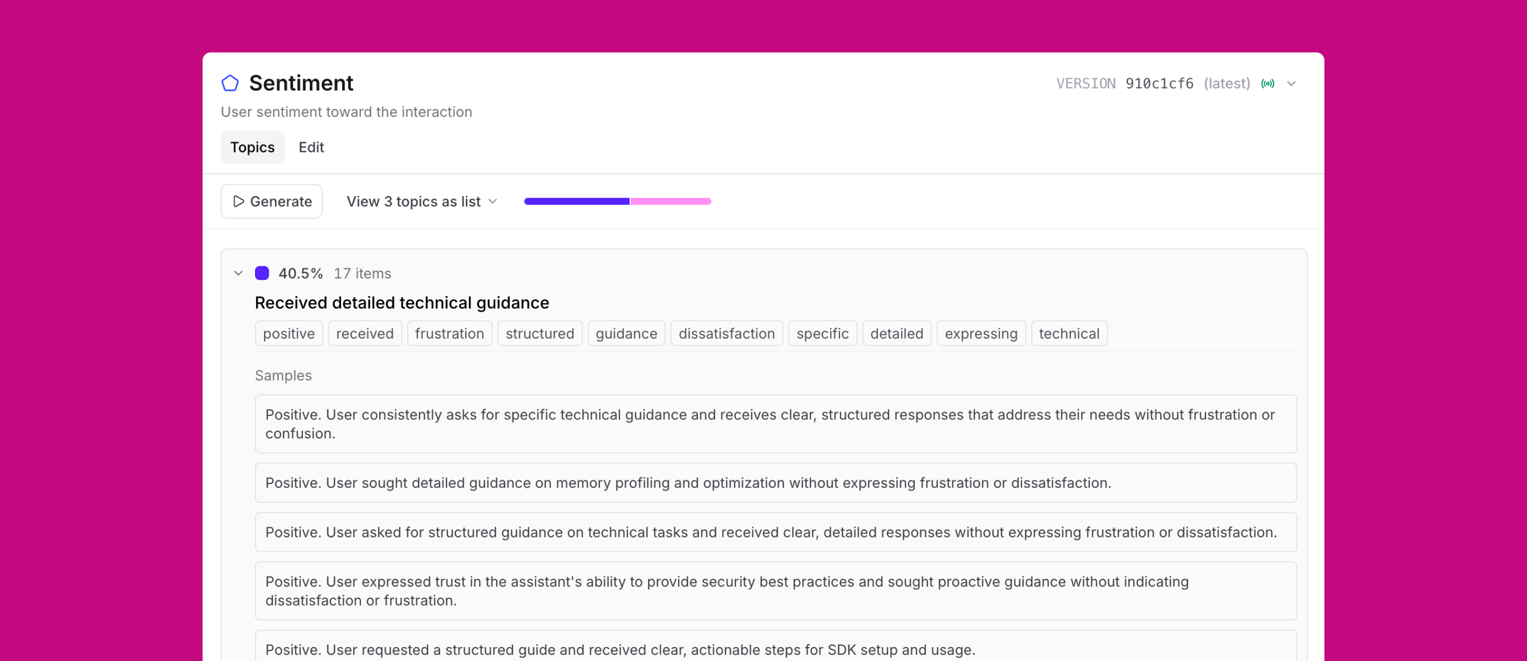 Topics view showing sentiment clusters with distribution and sample traces